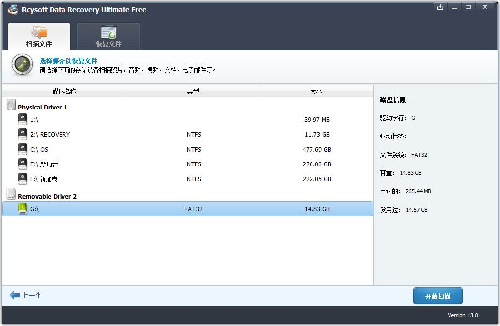 在您的计算机上下载,安装并启动Rcysoft Data Recovery Ultimate免费版软件,选择要恢复的文件类型,然后单击"开始"。