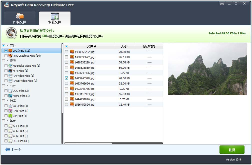 扫描完成后,所有可恢复的文件都将列在程序中。您可以检查文件的详细信息,例如文件名,大小,类型,修改时间和内容。选择要恢复的文件,然后单击"恢复"按钮立即恢复数据。