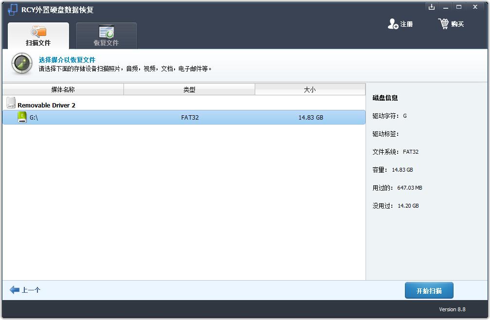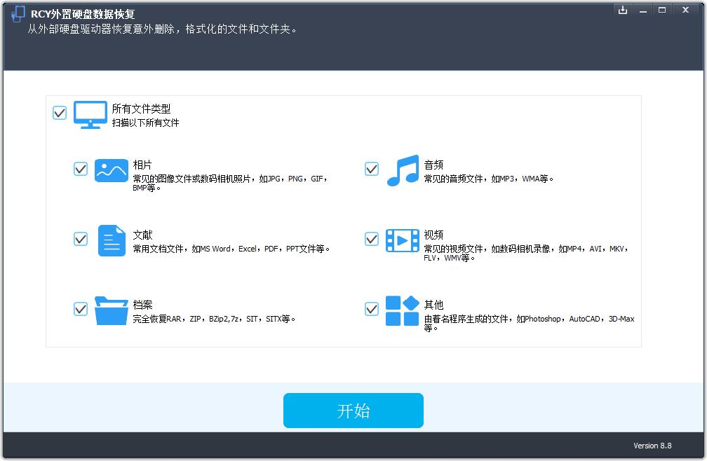 在您的计算机上下载,安装和启动Rcysoft外置硬盘数据恢复专业版软件。选择要恢复的文件类型,然后单击"开始"按钮。