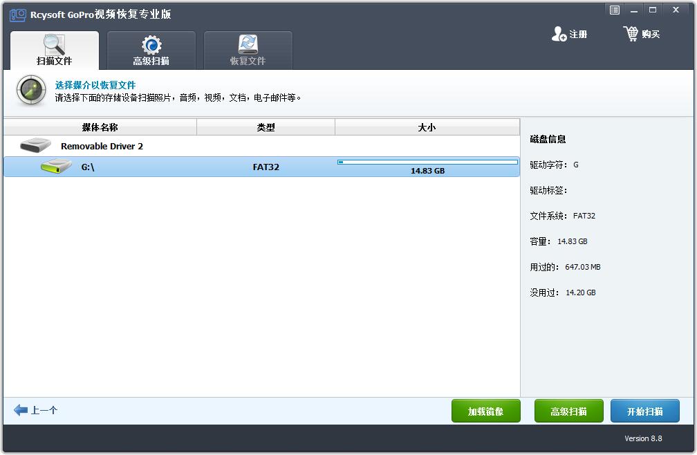 选择磁盘列表中的GoPro SD卡驱动器,单击"开始扫描"按钮进行处理。