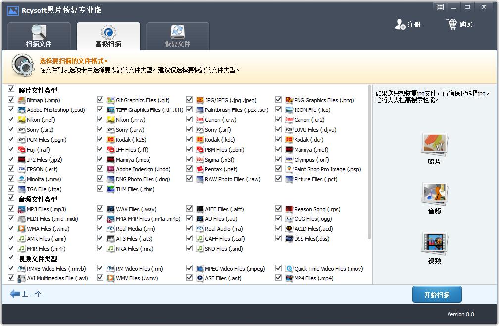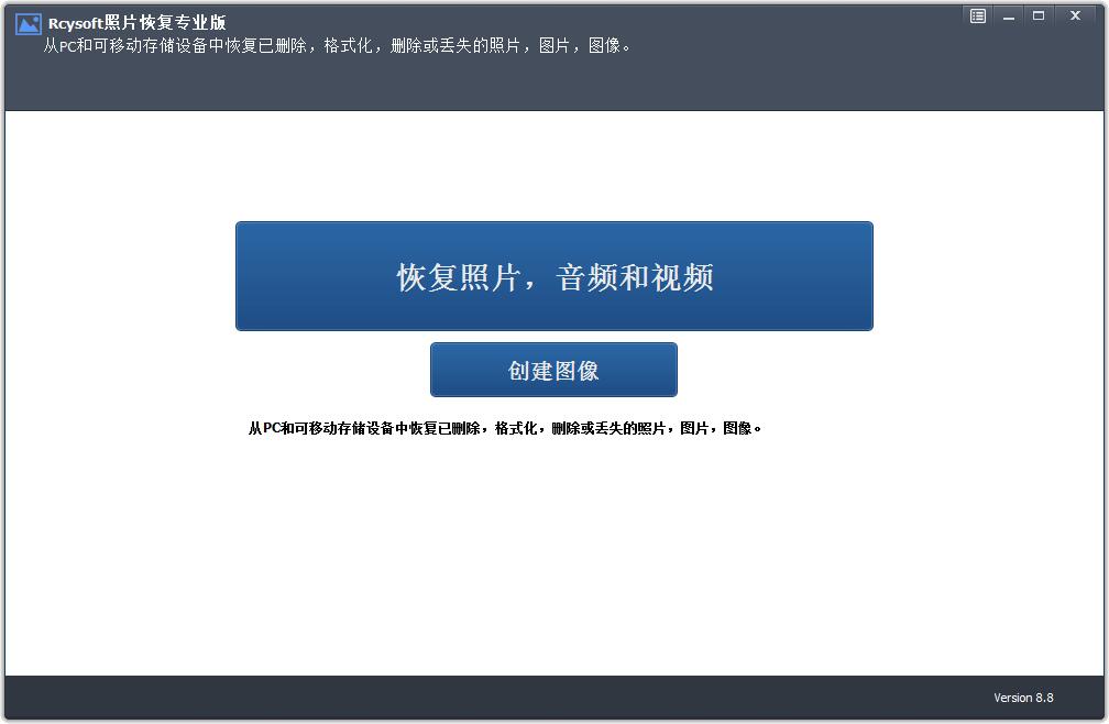 在您的计算机上下载,安装和启动Rcysoft Photo Recovery Pro软件。单击"恢复照片,音频和视频"按钮。