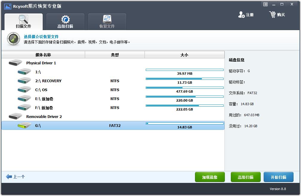 选择磁盘列表中丢失照片的驱动器,单击"开始扫描"按钮进行处理。