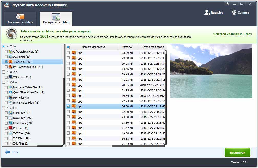 Cuando se complete el análisis, todos los archivos recuperables se enumerarán en el programa. Puede verificar los detalles del archivo, como el nombre del archivo, tamaño, tipo, tiempo modificado y contenido. Seleccione los archivos que desea recuperar y luego haga clic en el botón "Recuperar" para recuperar sus datos inmediatamente.