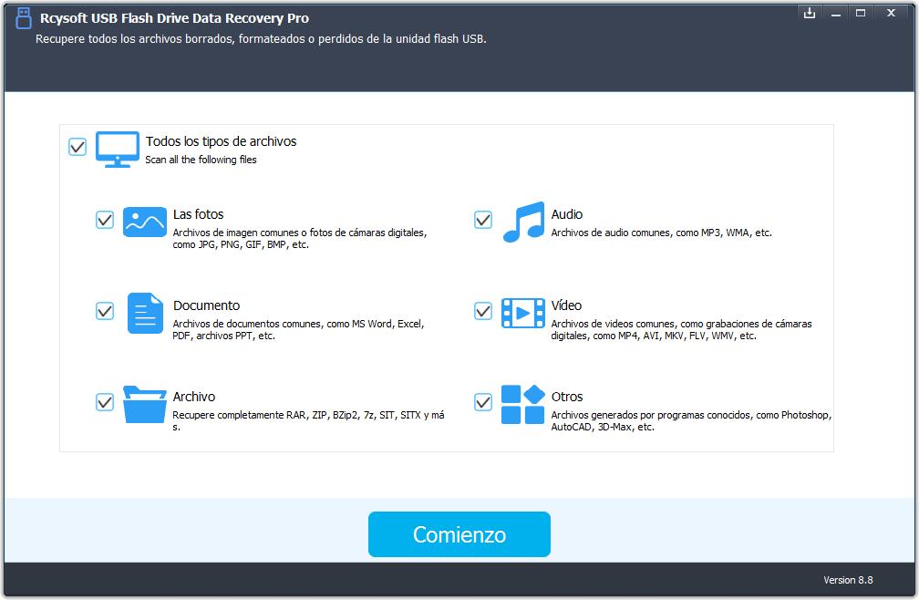 Descargue, instale y ejecute el software Rcysoft USB Flash Drive Data Recovery Pro en su computadora. Seleccione los tipos de archivos que desea recuperar y haga clic en el botón "Inicio".