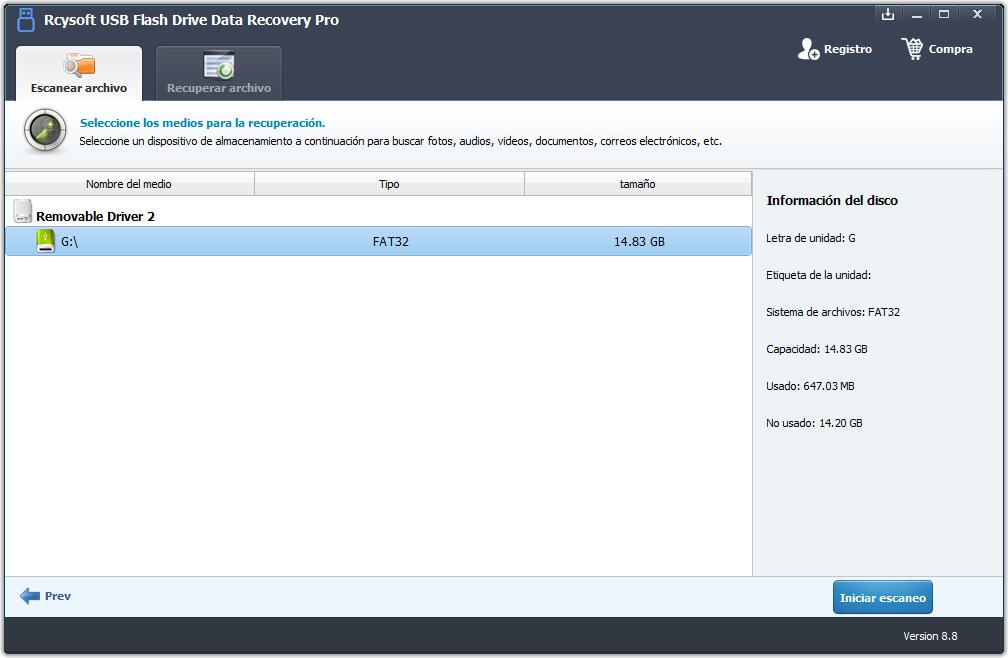 Seleccione la unidad flash USB en la lista de discos, haga clic en el botón "Iniciar escaneo" para procesar.