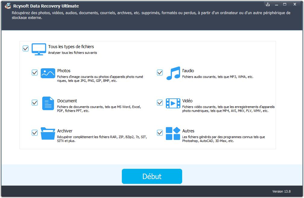 Téléchargez, installez et lancez Rcysoft Data Recovery Ultimate sur votre ordinateur, choisissez les types de fichiers à récupérer, puis cliquez sur "Démarrer".