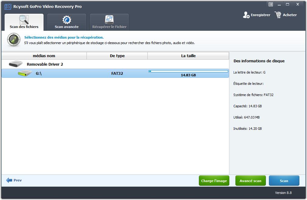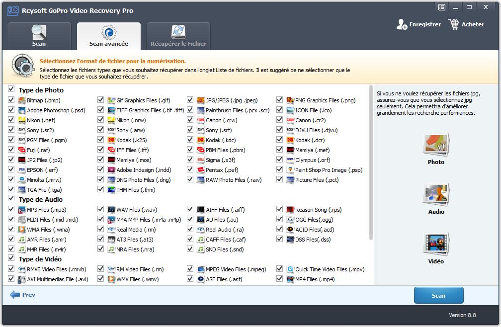 Le logiciel Rcysoft GoPro Video Recovery Pro prend entièrement en charge la récupération de photos / vidéos à partir de caméras / caméscopes GoPro comme GoPro Hero 8/7/6/5, GoPro Hero 4 Argent, GoPro Hero 4 Session, GoPro Hero 3+, GoPro Hero 3 Noir, GoPro Hero. 3 Silver, Action GoPro Hero, Casque GoPro HD Helper, GoPro HD Hero 2, etc. Quelles que soient les raisons pour lesquelles vous avez perdu des fichiers GoPro, telles que la suppression accidentelle de fichiers GoPro, la carte SD de la caméra GoPro formatée ou devenue RAW, vous pouvez récupérer tous photos et vidéo perdues.