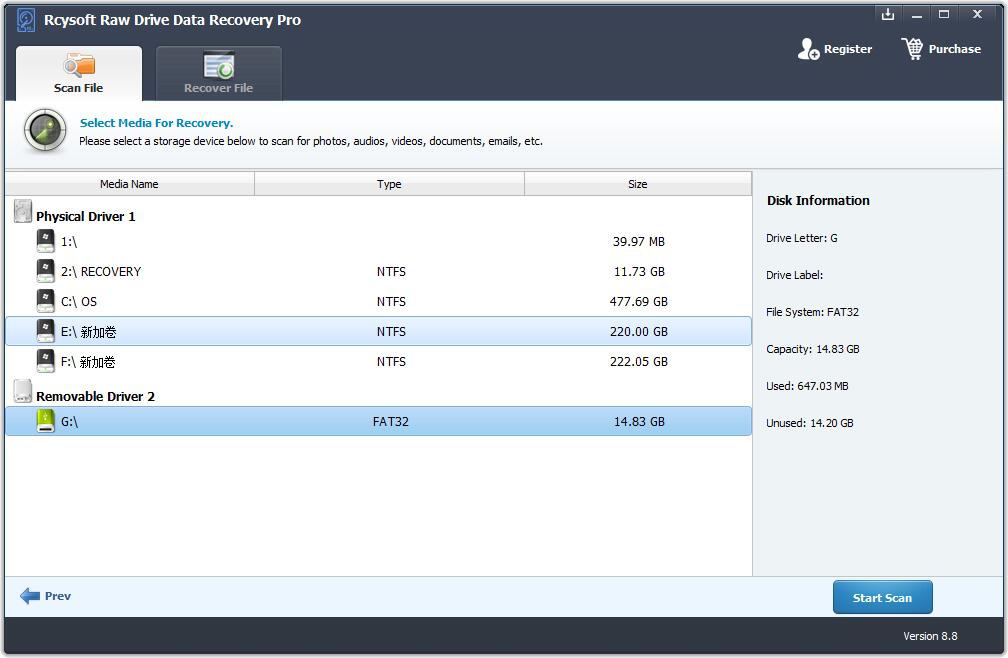 Download, install and launch Rcysoft Raw Drive Data Recovery Pro software on your computer. Select file types you want to recover and click "Start" button.