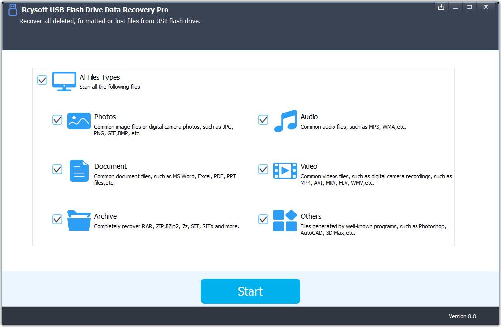 Download, install and launch Rcysoft USB Flash Drive Data Recovery Pro software on your computer. Select file types you want to recover and click "Start" button.