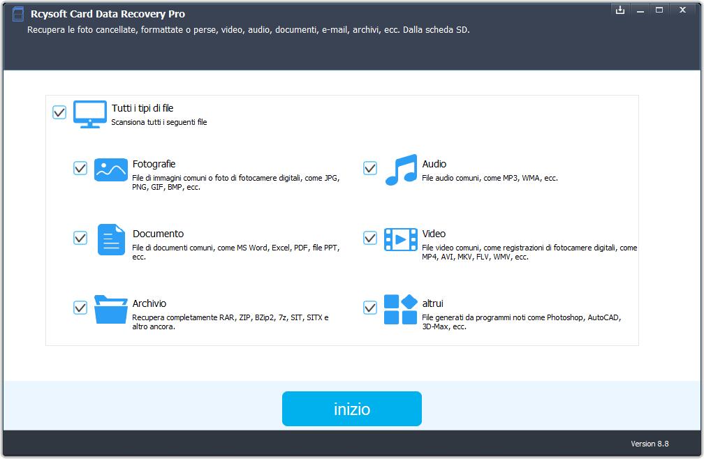 Scarica, installa e avvia il software Rcysoft Card Data Recovery Pro sul tuo computer. Seleziona i tipi di file che vuoi recuperare e fai clic sul pulsante "Start".