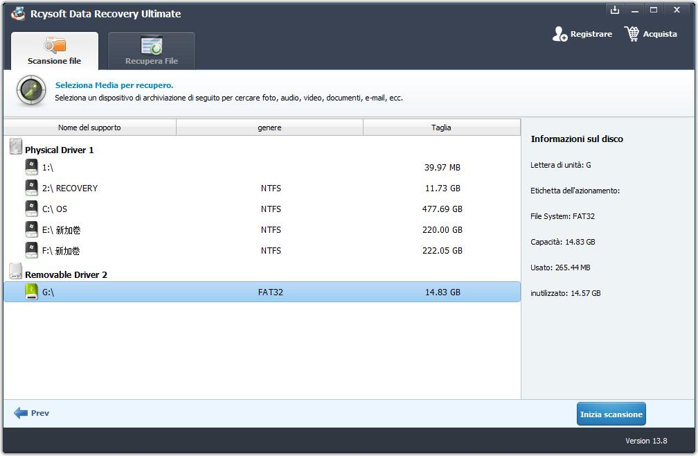 Scarica, installa e avvia Rcysoft Data Recovery Ultimate sul tuo computer, scegli i tipi di file da ripristinare e fai clic su "Start".