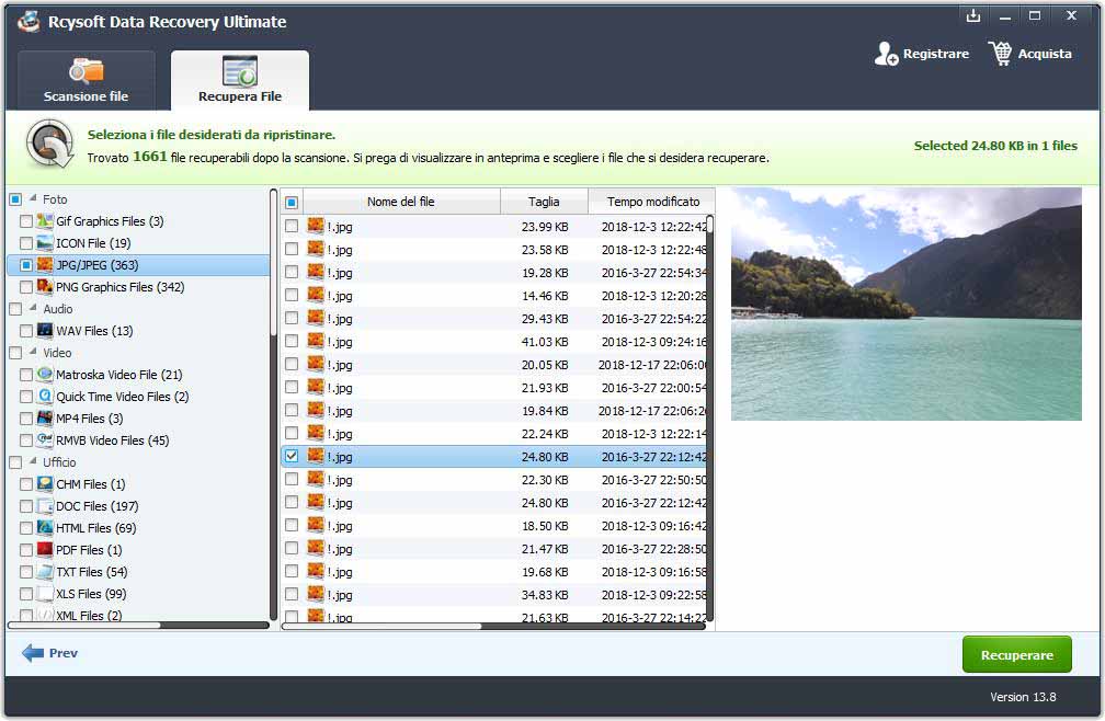 Quando la scansione è completata, tutti i file recuperabili saranno elencati nel programma. È possibile controllare i dettagli del file come nome del file, dimensione, tipo, ora e contenuto modificati. Seleziona i file che desideri recuperare, quindi fai clic sul pulsante "Ripristina" per recuperare immediatamente i tuoi dati.