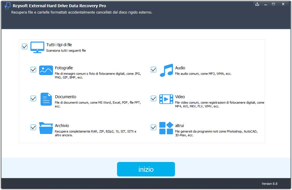 Scarica, installa e avvia il software Rcysoft External Hard Drive Data Recovery Pro sul tuo computer. Seleziona i tipi di file che vuoi recuperare e fai clic sul pulsante "Start".