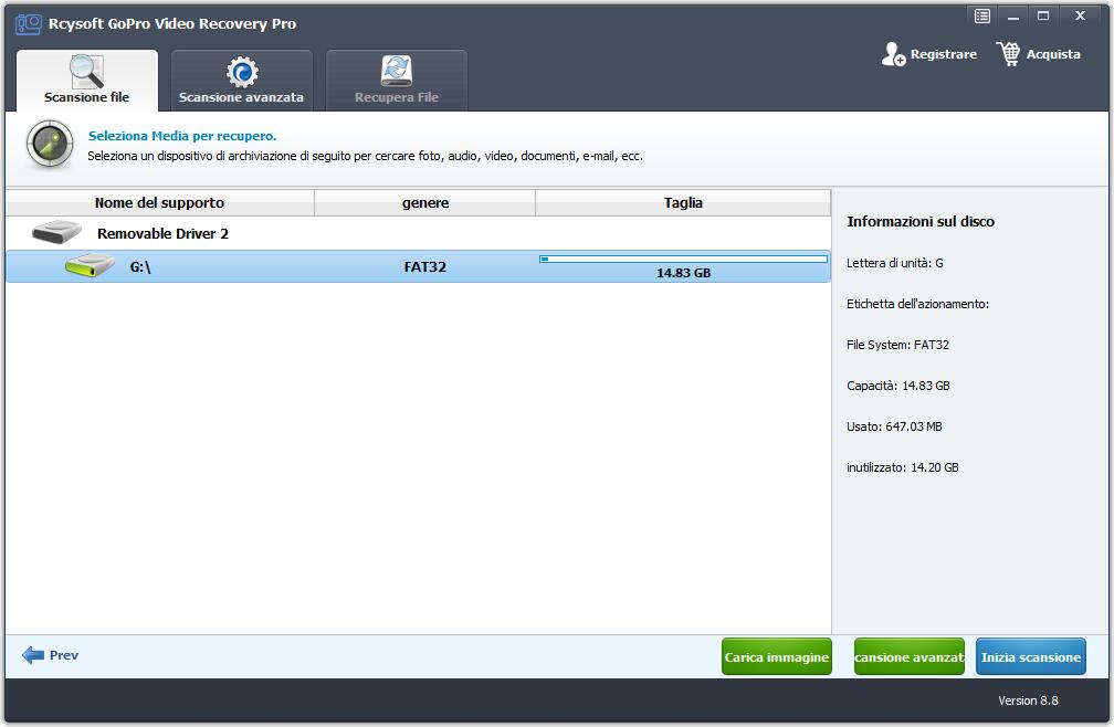 Selezionare l'unità della scheda SD GoPro nell'elenco dei dischi, fare clic sul pulsante "Avvia scansione" per elaborare.