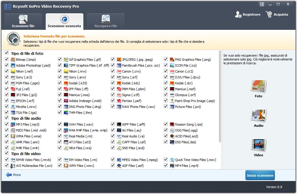 Il software Rcysoft GoPro Video Recovery Pro supporta completamente il recupero di foto / video da fotocamere GoPro / videocamere come GoPro Hero 8/7/6/5, GoPro Hero 4 Silver, GoPro Hero 4 Session, GoPro Hero 3+, GoPro Hero 3 Black, GoPro Hero 3 Silver, GoPro Hero Action, GoPro HD Helmet Hero, GoPro HD Hero 2, ecc. Non importa per quale motivo hai perso i file GoPro, come la cancellazione accidentale del file GoPro, la scheda SD della fotocamera GoPro formattata o RAW, puoi tornare indietro foto e video persi.