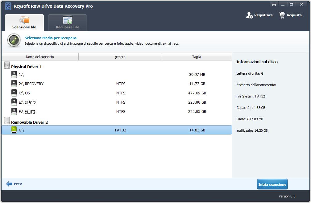 Scarica, installa e avvia il software Rcysoft Raw Drive Data Recovery Pro sul tuo computer. Seleziona i tipi di file che vuoi recuperare e fai clic sul pulsante "Start".