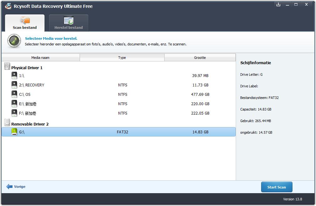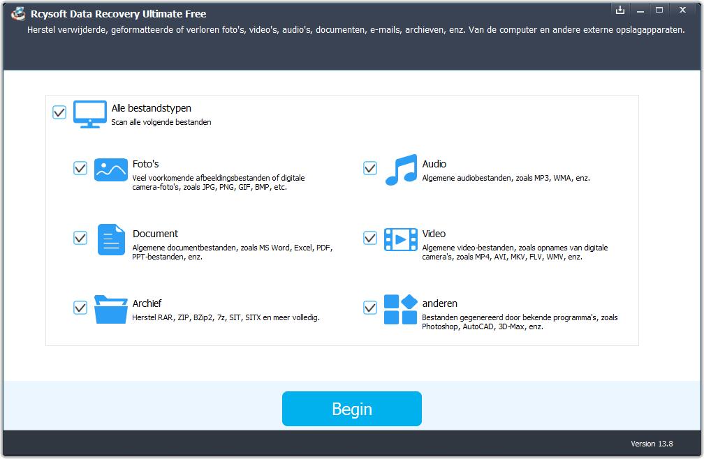 Download, installeer en start de Rcysoft Data Recovery Ultimate Free Edition-software op uw computer, kies de bestandstypen die u wilt herstellen en klik vervolgens op "Start".