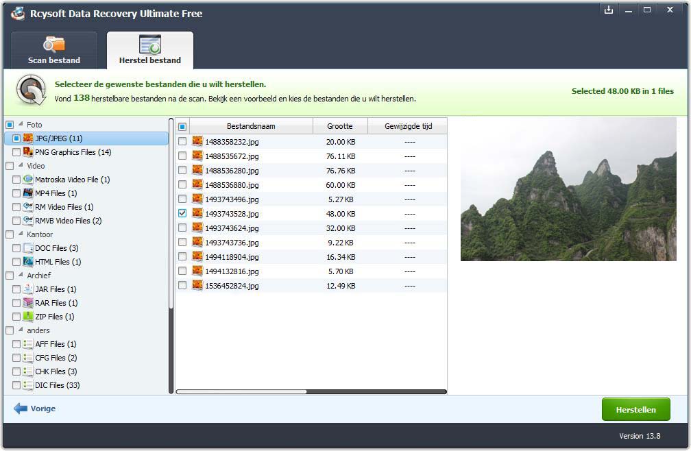 Wanneer de scan is voltooid, worden alle herstelbare bestanden in het programma vermeld. U kunt de details van het bestand controleren, zoals bestandsnaam, grootte, type, gewijzigde tijd en inhoud. Selecteer bestanden die u wilt herstellen en klik vervolgens op de knop "Herstellen" om uw gegevens onmiddellijk terug te krijgen.