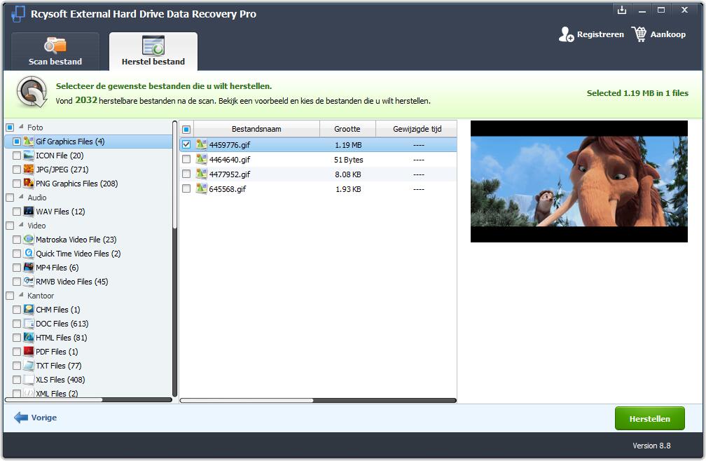 Na de scan kunt u een voorbeeld van alle herstelbare bestanden van de externe harde schijf bekijken. Klik op de knop "Recover" om verloren bestanden terug te krijgen.