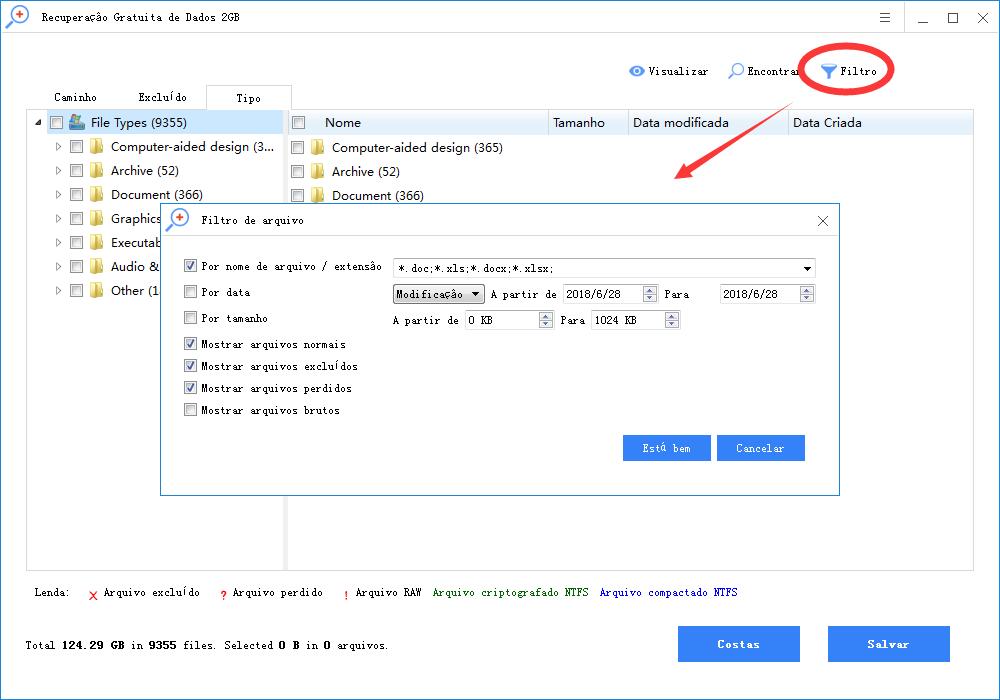 Met deze filteroptie kunnen gebruikers bestanden zoeken op bestandsnaam / extensie, bestandsgrootte, aanmaak- of wijzigingsdatum en kunnen gebruikers er ook voor kiezen om verwijderde, verloren of normale bestanden weer te geven op basis van hun behoeften. Klik gewoon op de knop Filter en maak een aantal geavanceerde instellingen In het pop-upvenster.