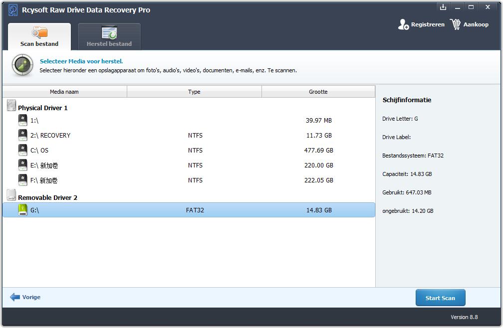 Selecteer het station waar u foto's kwijt bent geraakt in de schijflijst en klik op de knop "Scan starten" om te verwerken.