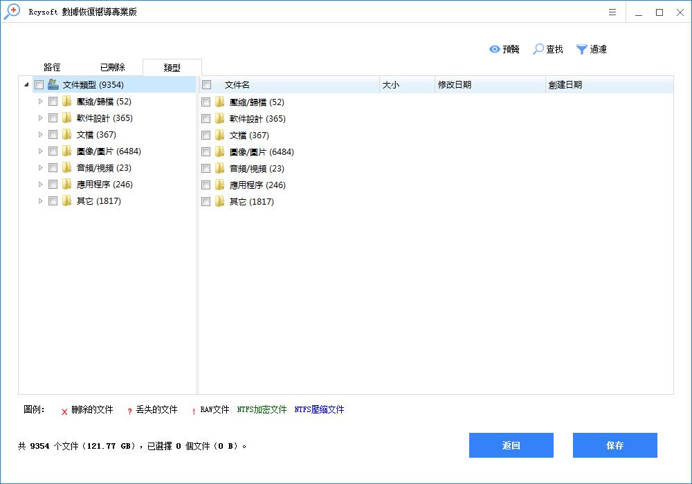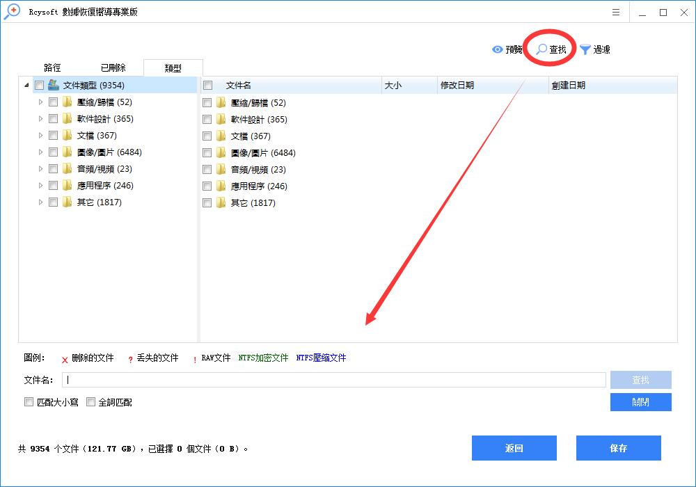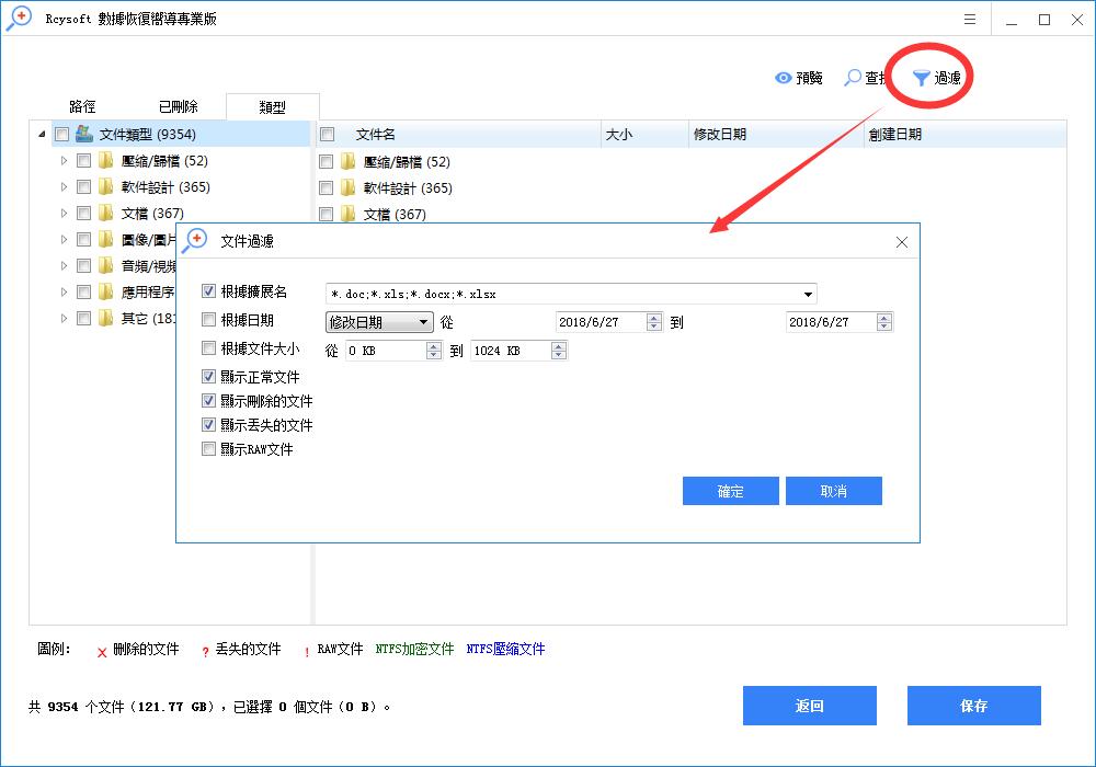 此篩選選項使用戶能夠按文件名/擴展名,文件大小,創建或修改日期搜索文件。 此外,用戶還可以根據自己的需要選擇顯示已刪除,丟失或正常的文件。 只需點擊過濾按鈕,並在彈出窗口中進行一些高級設置。
