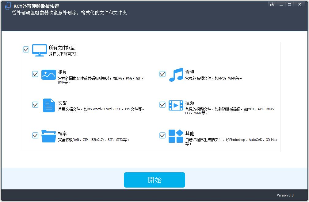 在您的計算機上下載,安裝和啟動Rcysoft外置硬盤數據恢復專業版軟件。選擇要恢復的文件類型,然後單擊"開始"按鈕。