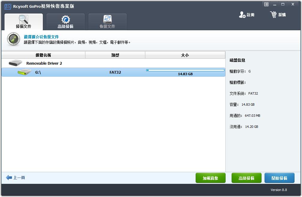 選擇磁盤列表中的GoPro SD卡驅動器,單擊"開始掃描"按鈕進行處理。