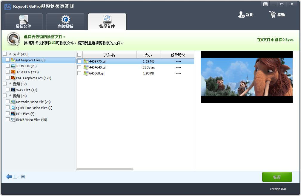 掃描完成後,您可以預覽GoPro中的所有可恢復照片和視頻文件。單擊"恢復"按鈕以找回丟失的文件。